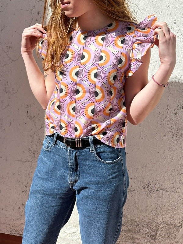Blusa sin mangas con volados. Posee cierre trasero con botón. Es fresca e ideal para combinar con Jeans, faldas, shorts. Su morfología permite darle un look casual y elegante.