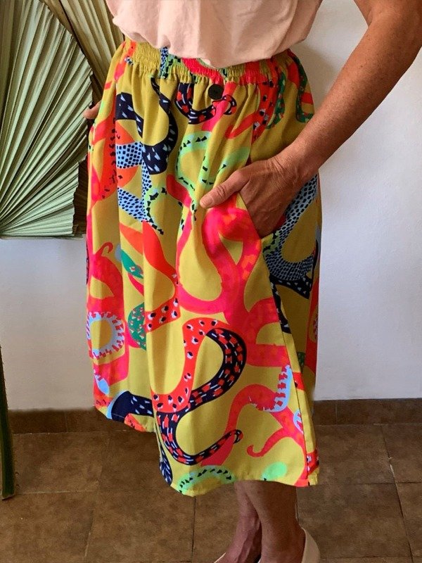 Falda con cintura elastizada. Tiene bolsillos escondidos. De corte clásico queda ideal colocándola a la altura de la cintura, con alguna prenda por adentro para enfatizar las curvas!