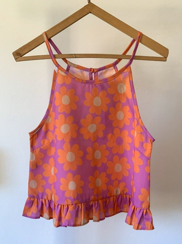 Top sin mangas con volados en bajo. Posee cierre trasero con botón. Es fresca e ideal para combinar con Jeans, faldas, shorts. Su morfología permite darle un look casual y elegante.