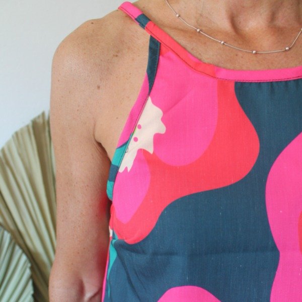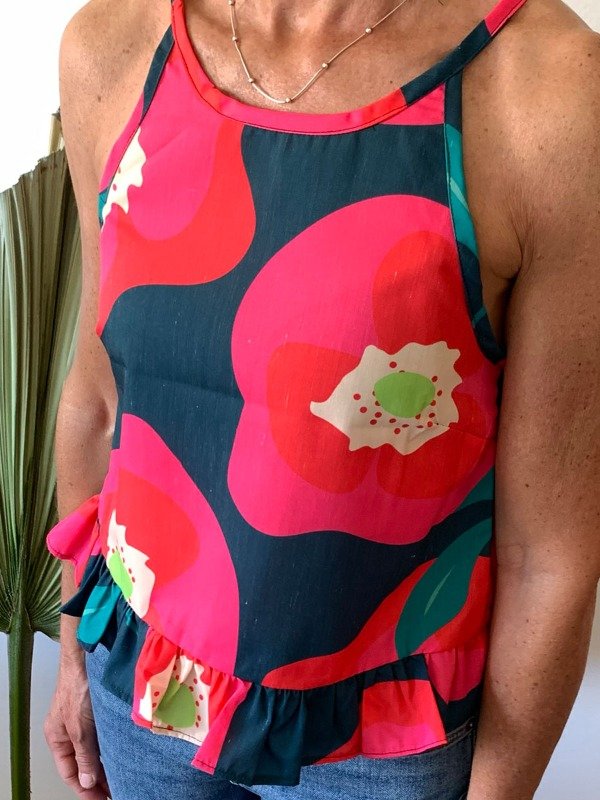 Top sin mangas con volados en bajo. Posee cierre trasero con botón. Es fresca e ideal para combinar con Jeans, faldas, shorts. Su morfología permite darle un look casual y elegante.